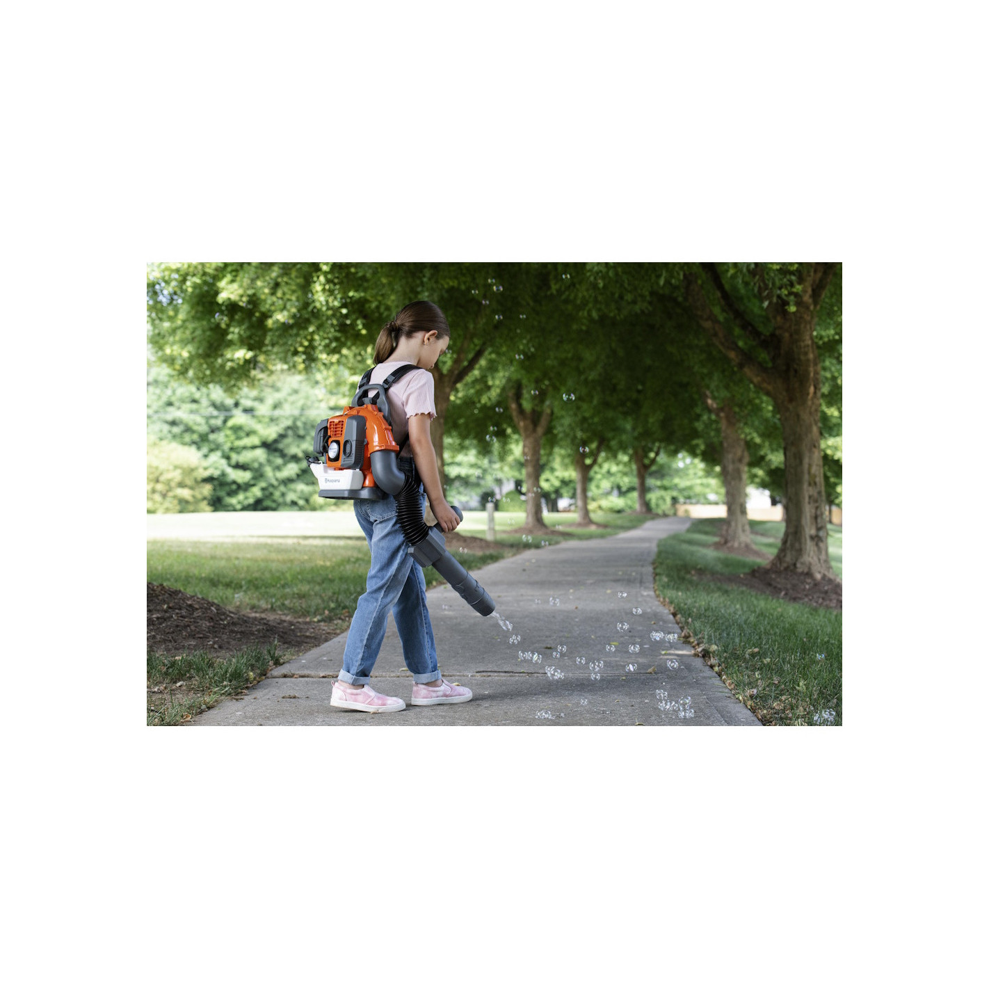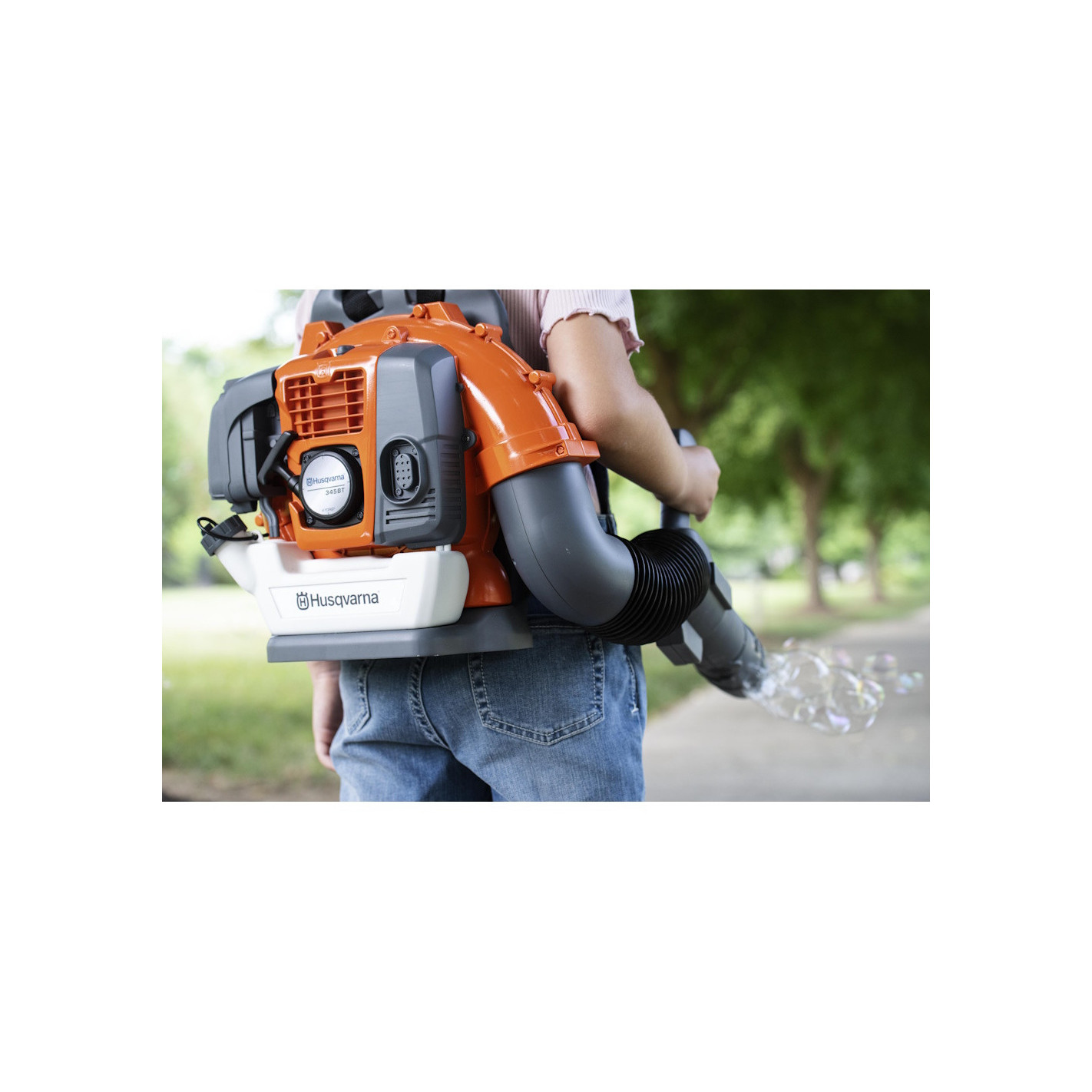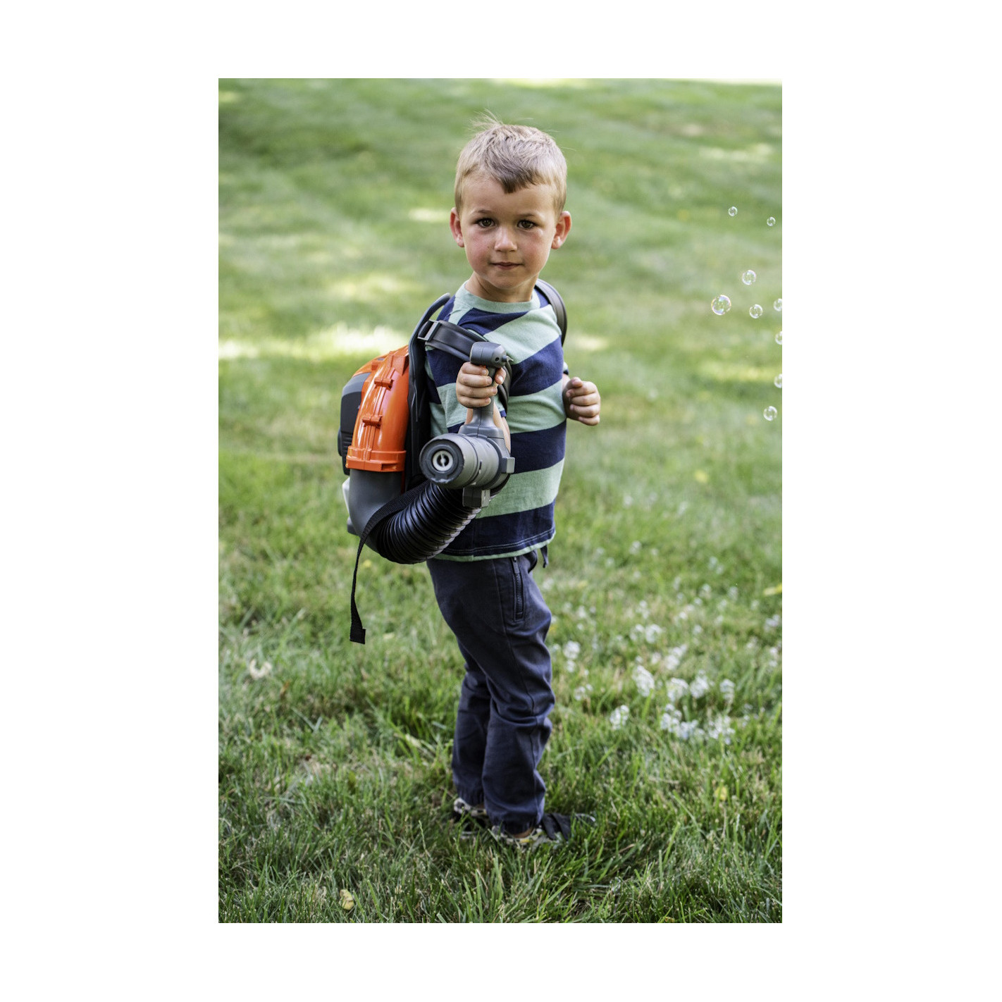 Sembra un vero soffiatore a zaino Husqvarna 345BT! Per bambini dai 3 anni in su. Emette un flusso costante di bolle all'attivazione del grilletto.