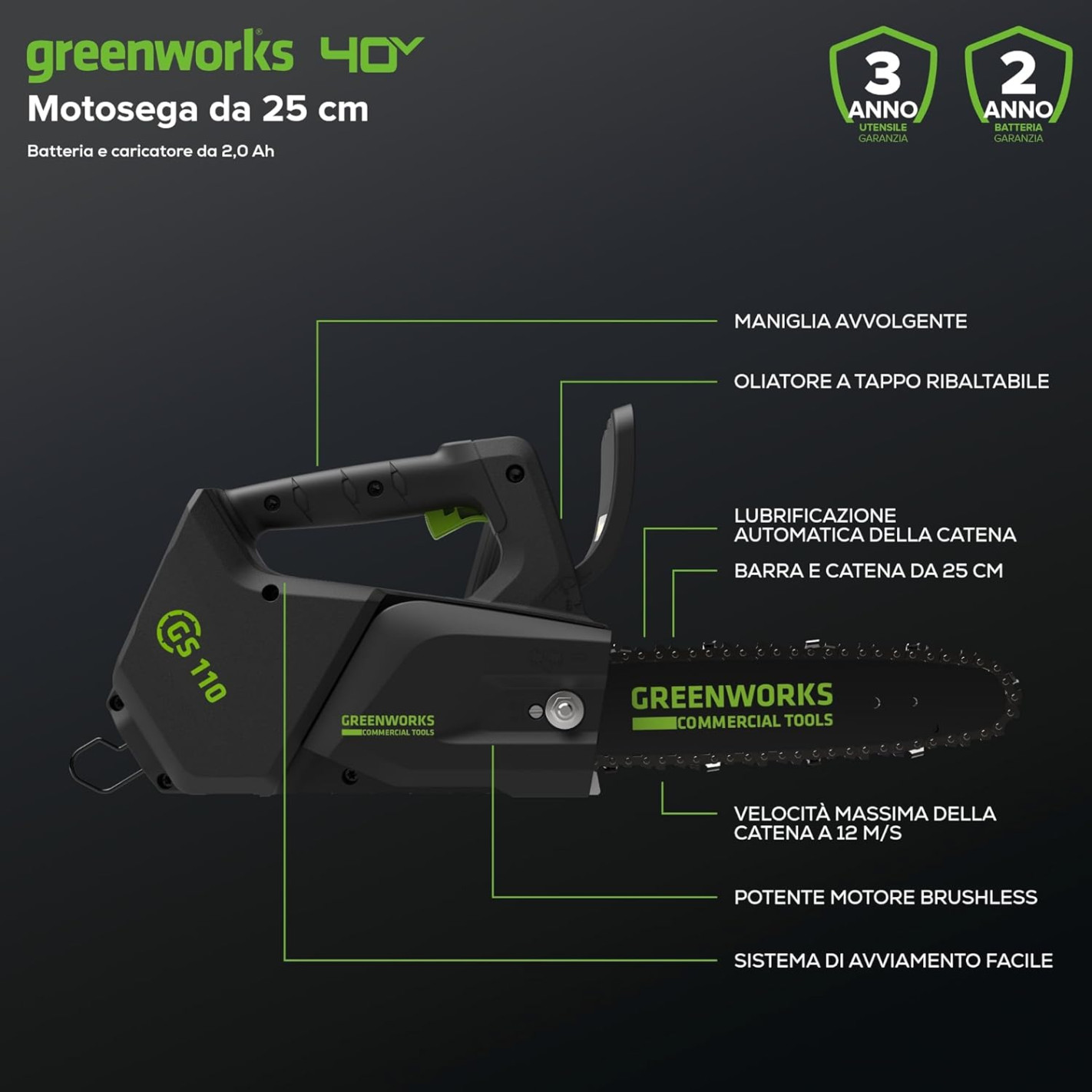 Il cuore della Greenworks GD40TCSK2 è il suo motore 40V, che garantisce una potenza costante e affidabile per affrontare anche i lavori più impegnativi. Grazie alla tecnologia cordless, potrai godere di una libertà di movimento senza limiti, senza il fastidio di cavi o la necessità di una presa di corrente. La velocità della catena di 16.2 m/s assicura tagli rapidi e precisi, mentre la barra Oregon da 25 cm (10") ti permette di lavorare su rami e tronchi di piccole e medie dimensioni con facilità. La combinazione di potenza e maneggevolezza rende questa motosega ideale per una vasta gamma di applicazioni, dalla potatura di alberi da frutto alla preparazione della legna da ardere.