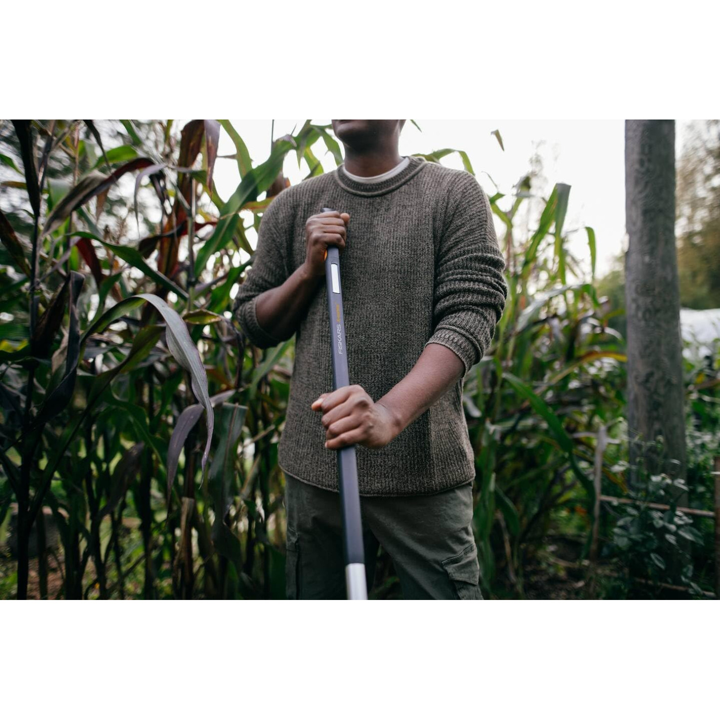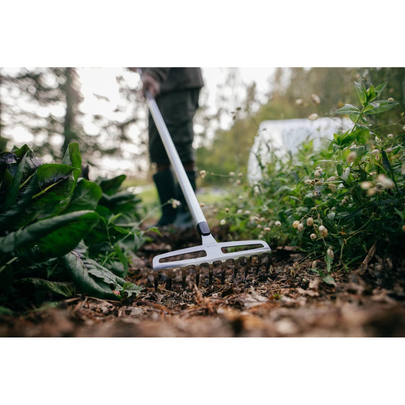 L'impugnatura ergonomica a S è stata sviluppata per ridurre l'affaticamento dell'operatore, consentendo una presa salda e confortevole. Questa caratteristica, combinata con il peso ridotto di soli 550 g, rende il Fiskars rastrello ideale per un uso prolungato senza stress eccessivo per mani e braccia.