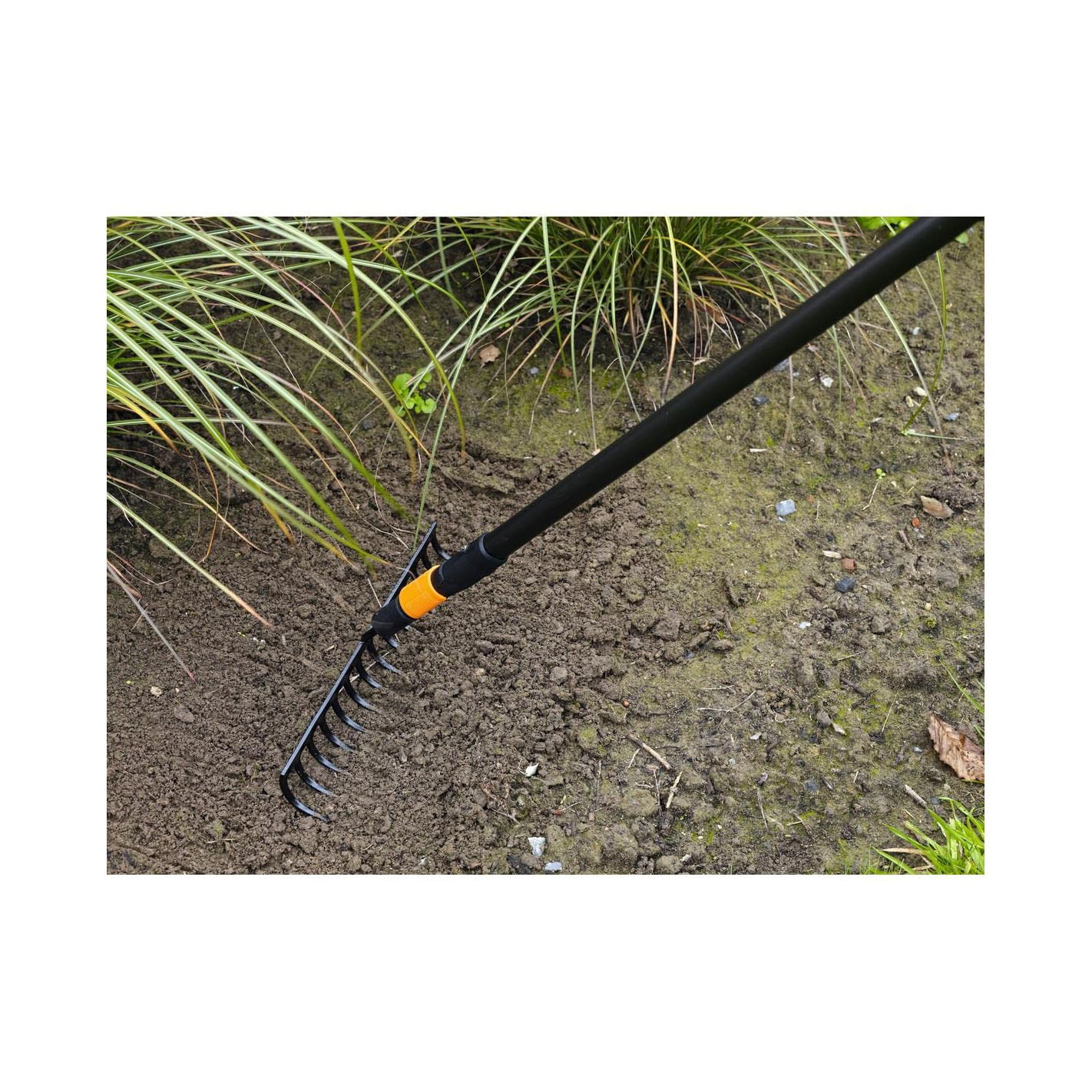 Il rastrello QuikFit è progettato per livellare il suolo e aerare il terreno in modo efficiente. La sua struttura in acciaio garantisce resistenza alla corrosione e durata nel tempo, rendendolo adatto all'uso intensivo in ambito professionale e hobbistico.