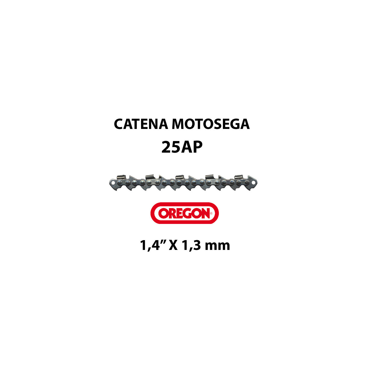 CATENA MOTOSEGA PASSO 1/4" x 1,3 mm (catena motosega Oregon 25AP): è la catena ideale per le motoseghe da potatura con barra carving - questa catena per motosega ha una distanza tra 3 rivetti consecutivi di circa 12,8 mm ed è disponibile esclusivamente con spessore da 1,3 mm.