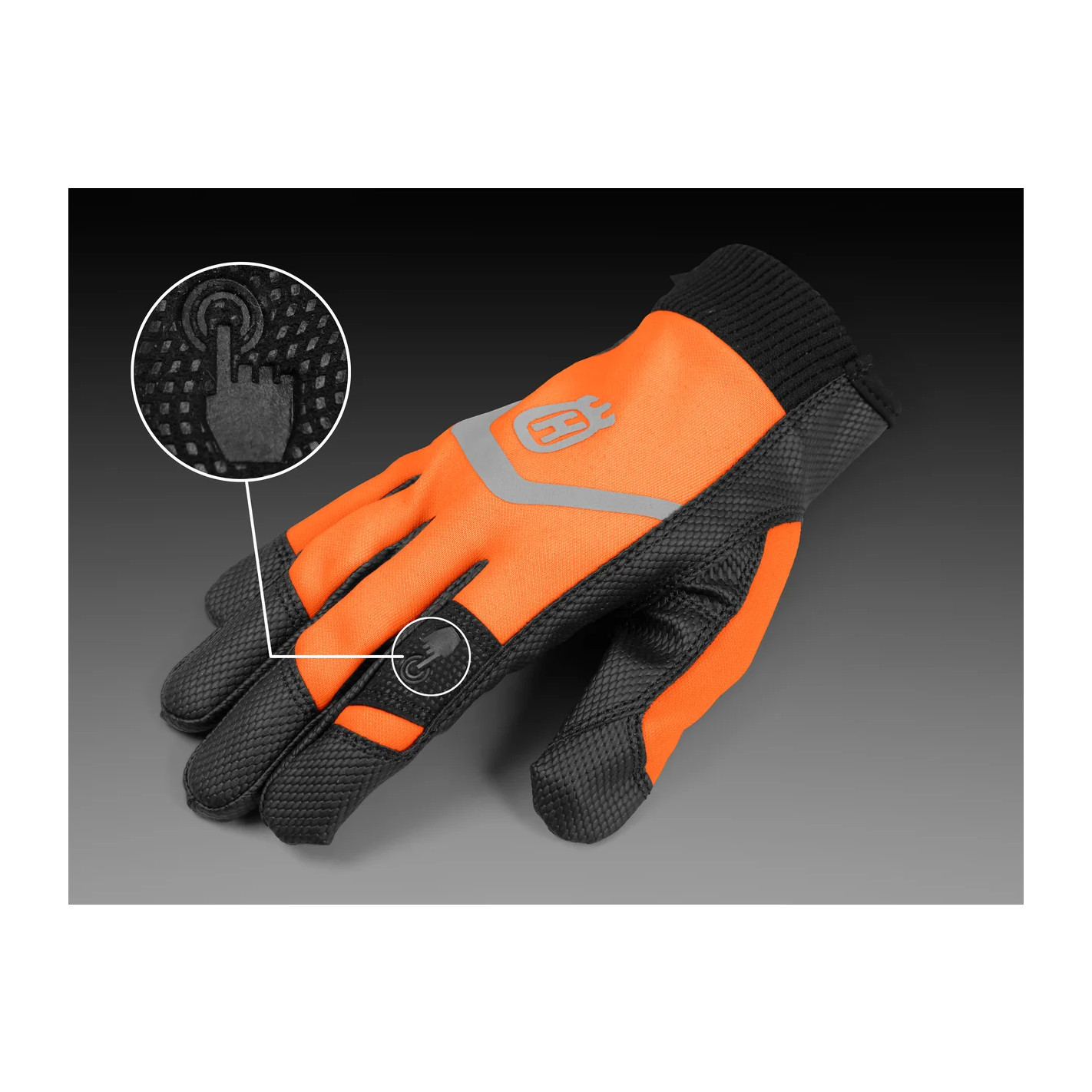 L'innovazione HUSQVARNA si manifesta in ogni dettaglio di questi guanti. Il dito indice è dotato di una sezione compatibile con gli schermi touch, consentendo l'uso di smartphone e dispositivi digitali senza la necessità di rimuovere i guanti. Questa caratteristica si rivela particolarmente utile per consultare rapidamente informazioni o effettuare chiamate senza interrompere il flusso di lavoro.