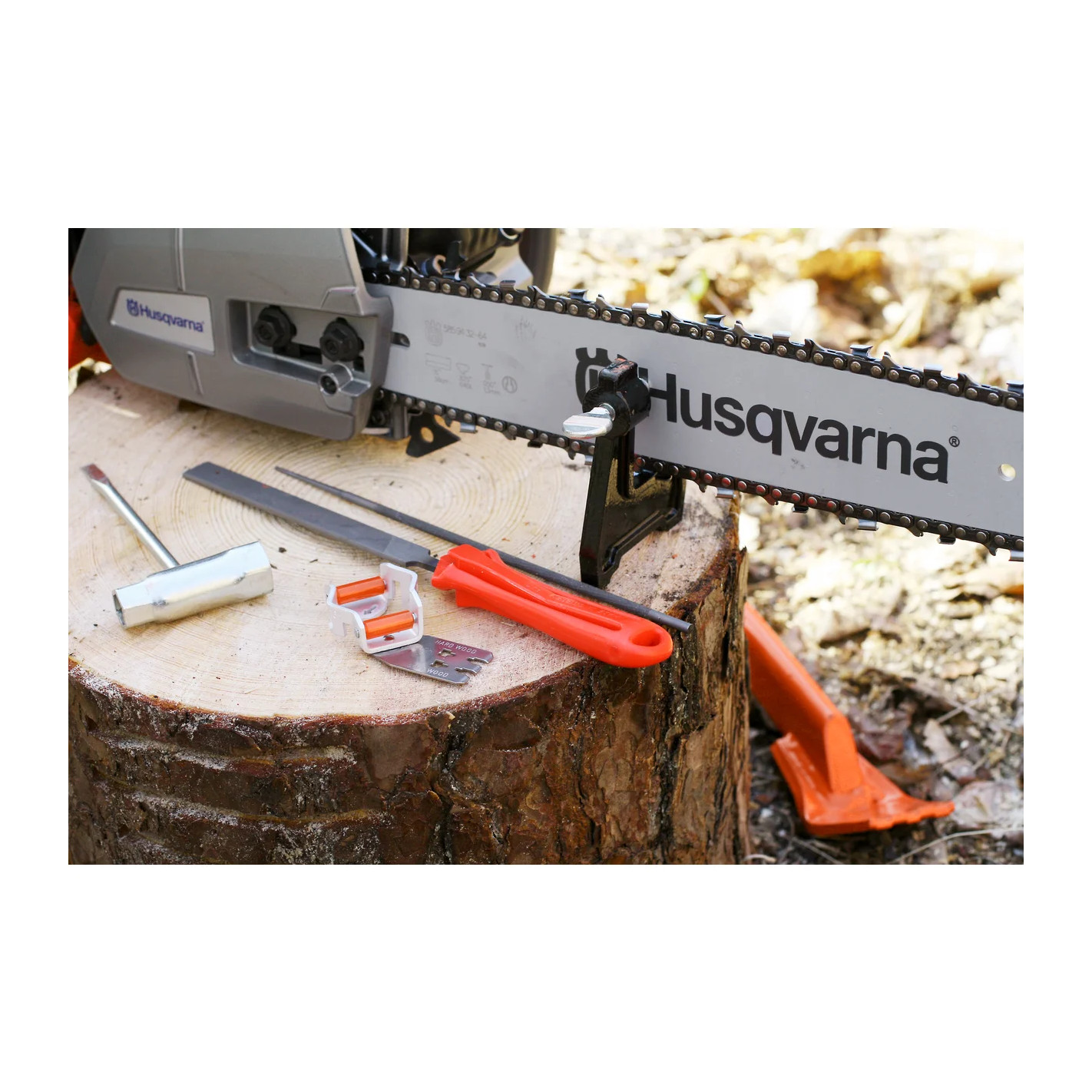 Il manico arancione Husqvarna è progettato per massimizzare l'efficienza e la precisione nel lavoro di affilatura. La sua colorazione vivace aumenta la visibilità, riducendo il rischio di smarrimento durante l'uso in ambienti esterni o officine affollate.
