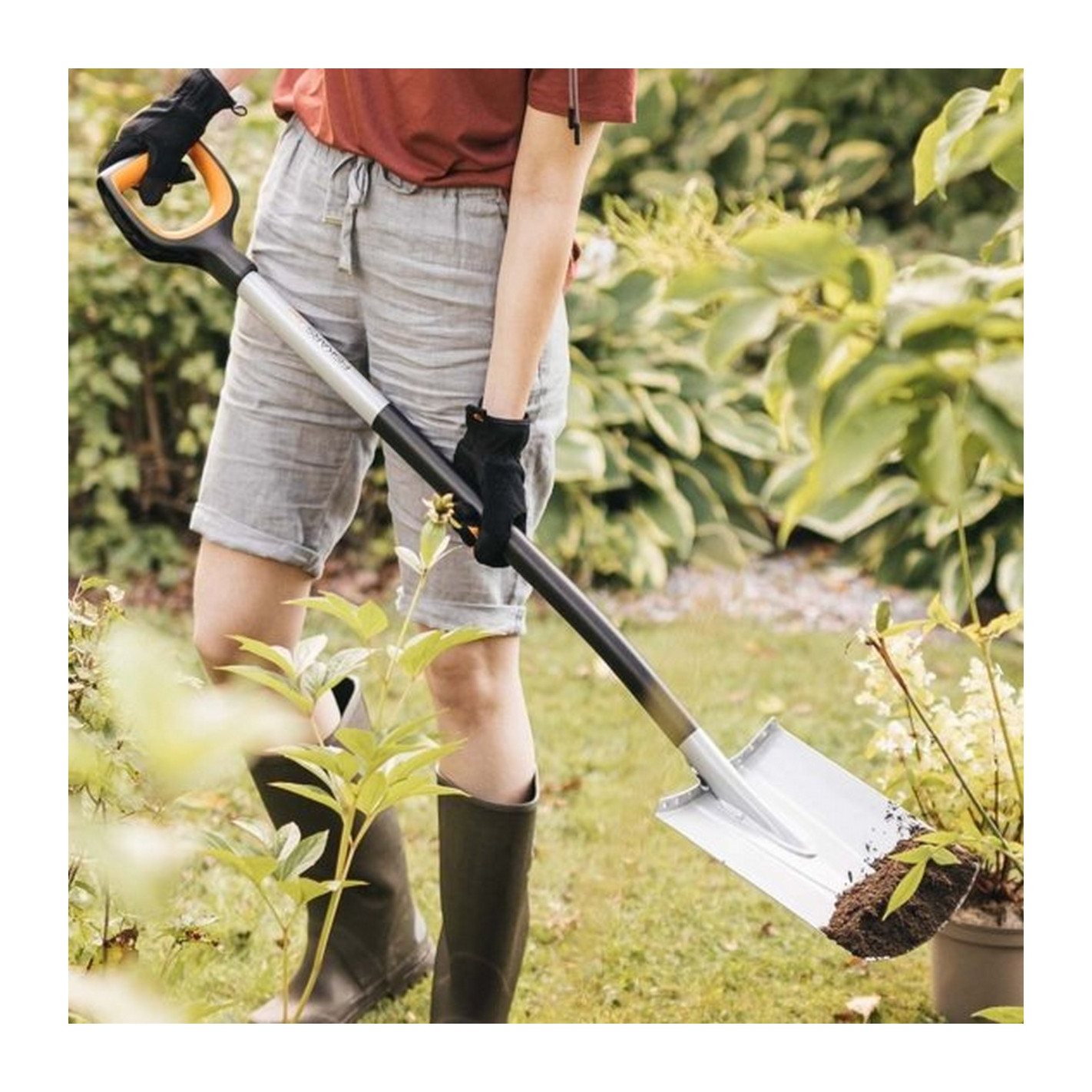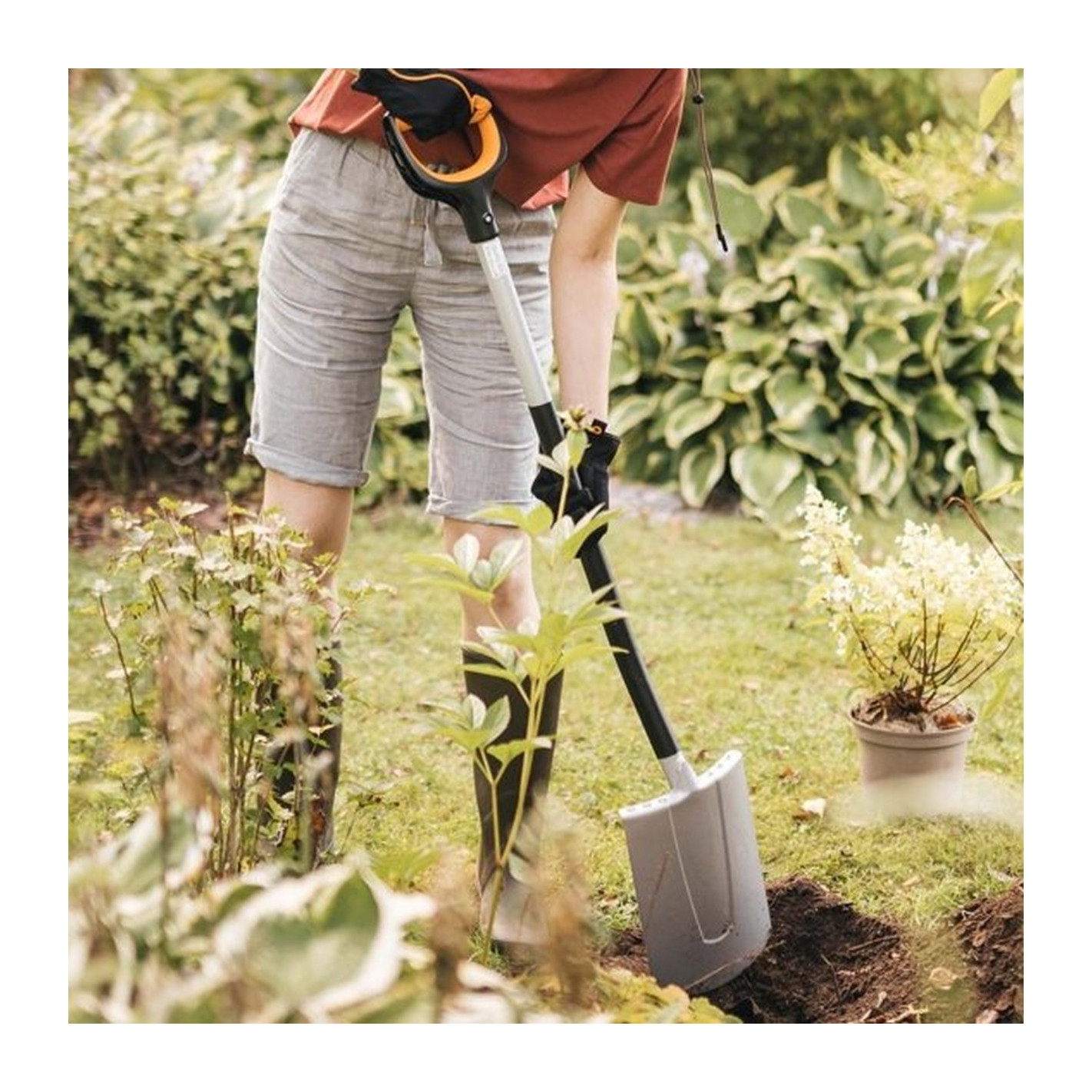 L'impugnatura ergonomica in plastica rinforzata con fibra di vetro, dotata del sistema SoftGrip®, assicura una presa salda e confortevole, riducendo l'affaticamento durante le sessioni di lavoro prolungate. Il bordo affilato della lama permette una penetrazione agevole nel terreno, ottimizzando l'efficienza nelle operazioni di scavo e bordatura delle aiuole.