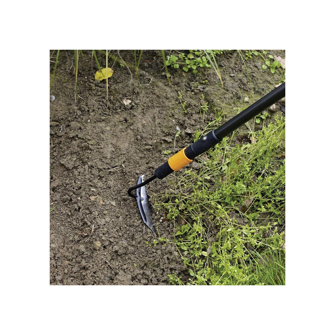 Il sistema QuikFit della Fiskars aumenta notevolmente la funzionalità di questo attrezzo, consentendo di sostituire rapidamente la testa della zappa con altri accessori compatibili, adattandosi così a diverse esigenze di giardinaggio.